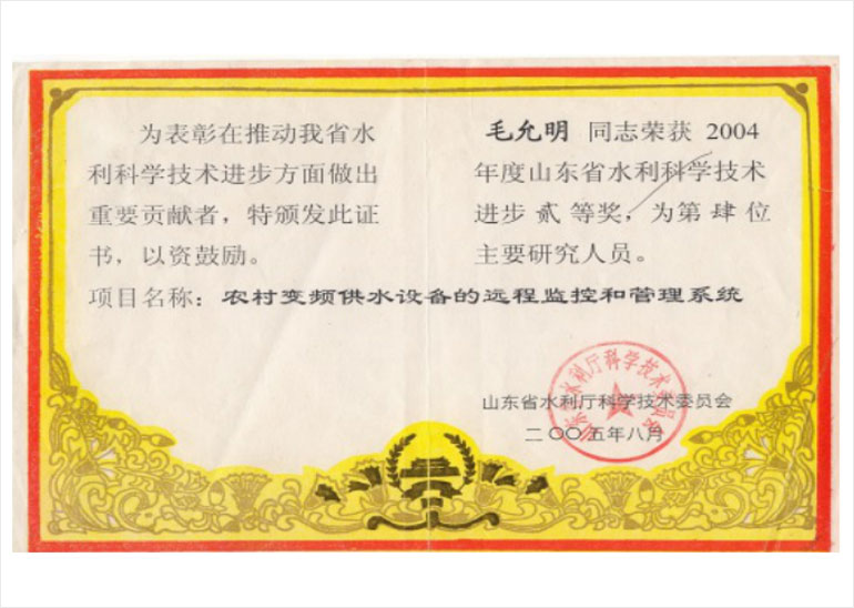 在“依科技创新发展”的理念引导下,为进一步提高农村变频供水系统的科技含量,完善农村供水管理和服务体系,公司研发了多项相关技术,其中“农村变频供水设备的远程监控和管理系统”及“供水自动化智能控制与全数字动态显示系统的研究”获得了山东省水利厅科学技术进步奖。